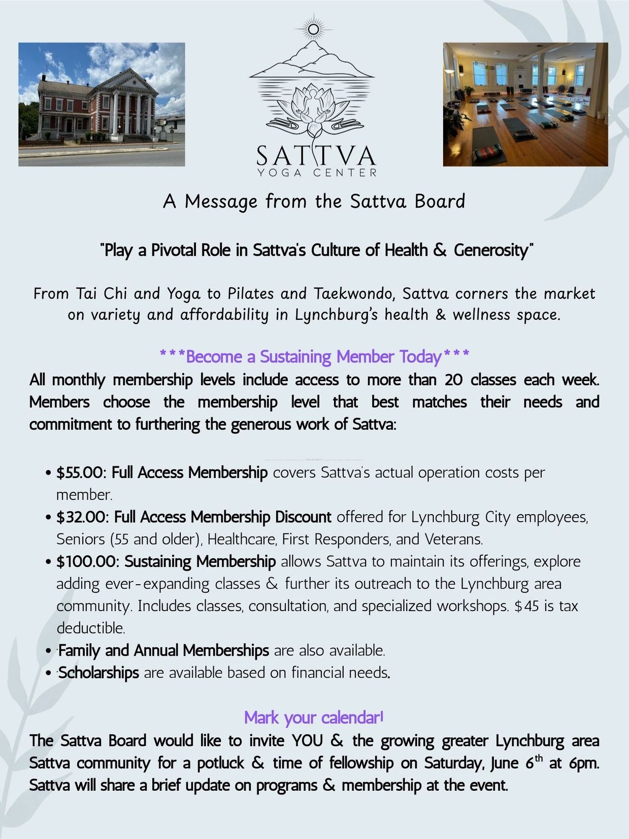For your monthly donation to the Sattva Yoga and Wellness Center you receive access to all Sattva Membership Classes including yoga, tai chi, taekwondo, kung fu, Pilates, and belly dance. Sustaining Members also receive consultations and specialized workshops free. $45 is tax deductible.